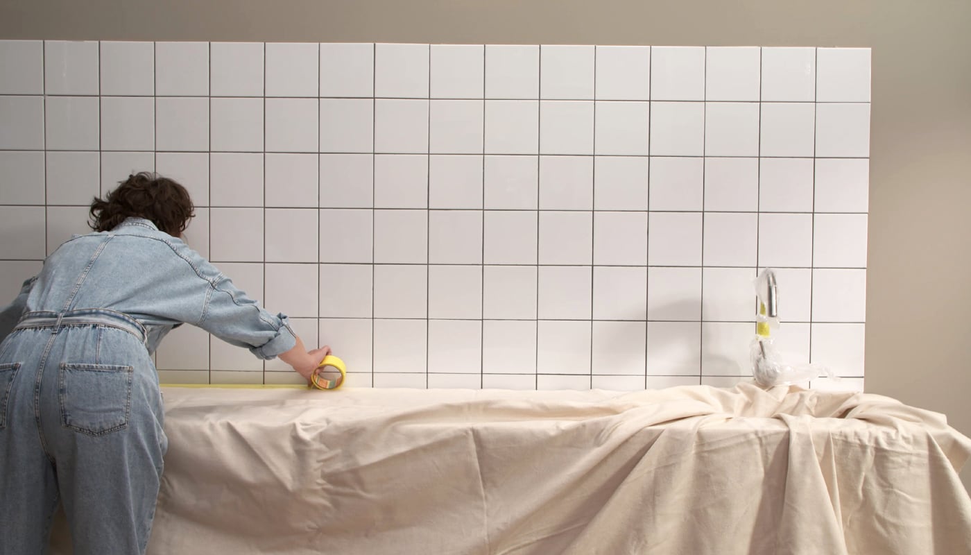 Sortez le ruban de masquage et commencez à délimiter votre zone de travail spécifique. Utilisez de longues bandes de ruban de masquage pour encadrer les bords de la zone et appuyez dessus fermement, cela rendra le bord aussi droit que possible. N'oubliez pas de recouvrir les prises, robinets ou autres appareils de ruban adhésif.