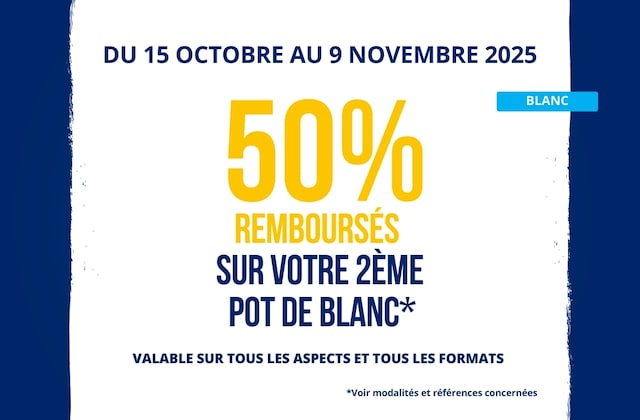 Offre valable sur tous les GRANDS BLANCS Dulux Valentine pour l'achat simultané de 2 pots. Tous les aspects et tous les formats sont éligibles à l’offre. Plus d’informations dans l’onglet « modalités ».